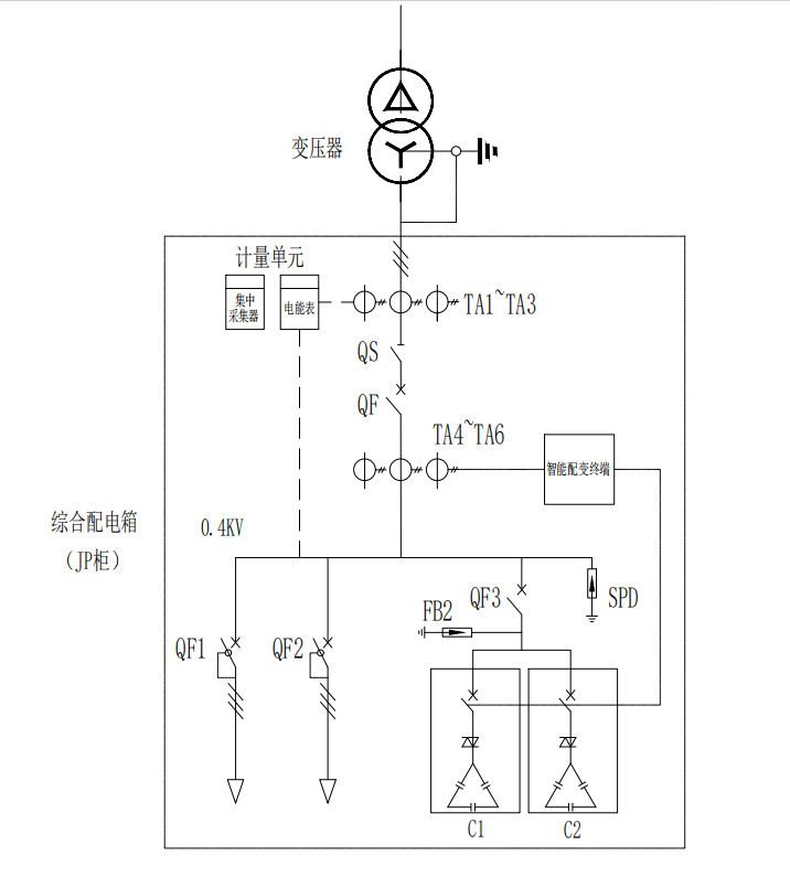 PXTF(JP)系列智能綜合配電箱適用于0.4KV系統(tǒng),城鄉(xiāng)電桿上公用配電變壓器低壓側(cè)安裝使用,簡(jiǎn)稱“JP柜”,根據(jù)配置功能不同,主要由公變采集終端、開(kāi)關(guān)設(shè)備、無(wú)功補(bǔ)償裝置、剩余電流保護(hù)器、防雷裝置、外殼及導(dǎo)體等核心部分組成,集合了配變監(jiān)測(cè)、電能計(jì)量、電能分配及無(wú)功補(bǔ)償?shù)裙δ苡谝惑w,起到變壓器剩余電流保護(hù)、遠(yuǎn)程控制、低壓集抄等多種功能作用,產(chǎn)品穩(wěn)定高效,廣泛應(yīng)用于農(nóng)網(wǎng)系統(tǒng)當(dāng)中。