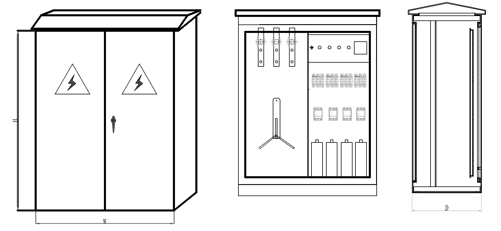 電能分配:內(nèi)部安裝進(jìn)線刀熔開(kāi)關(guān),出線斷路器,進(jìn)線刀熔開(kāi)關(guān)容量與出線斷路器容量及路數(shù)滿足配變?nèi)萘亢凸╇娨螅?